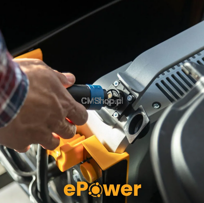 - W zestawie ładowarka 5 A, wtyczka do mulczowania, zaczep do przyczepy i uchwyt na telefon.