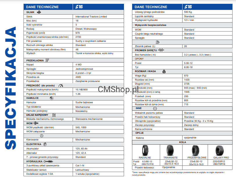 Wałek WOM oferuje dwie prędkości 540 oraz 1000 rpm, oczywiście traktorek dysponuje także zaczepem dolnym. Traktorek wyposażony został tylny podnośnik TUZ KAT I o udźwigu 500 kg, a także dwa wyjścia hydrauliczne w jednej sekcji.