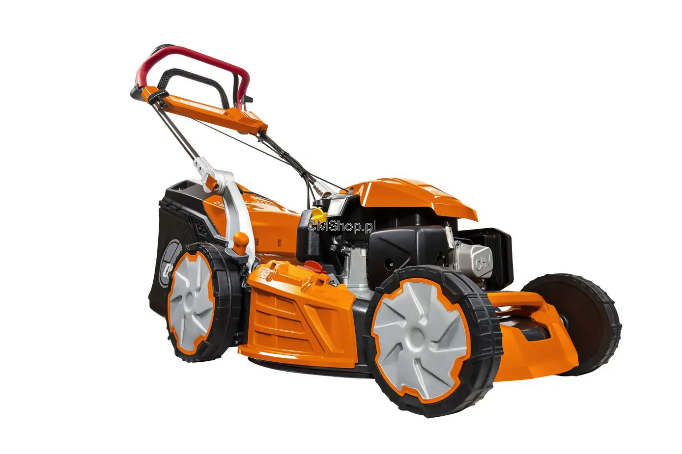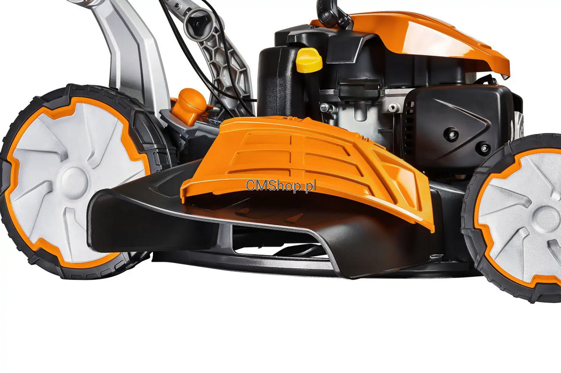 Zarówno dźwignia stopu oraz napędu dociskane są do ergonomicznego, miękkiego uchwytu, który ma za zadanie redukować drgania podczas pracy kosiarki.