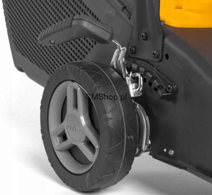 -Wysokość koszenia można szybko ustawić w 1 z 6 pozycji (w zakresie od 22 do 65 mm) za pomocą dźwigni na kole.