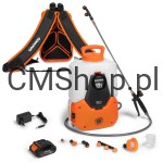 Opryskiwacz wyposażony jest w mocną pompę o wydajności do 3 l/min, co umożliwia rozpylenie ponad 350 l cieczy na jednym ładowaniu. Funkcja Auto Stop wyłącza pompę przy braku oprysku, oszczędzając energię i wydłużając czas pracy nawet o 20%
