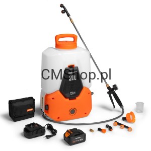 Opryskiwacz wyposażony jest w mocną pompę o wydajności do 3 l/min, co umożliwia rozpylenie ponad 350 l cieczy na jednym ładowaniu. Funkcja Auto Stop wyłącza pompę przy braku oprysku, oszczędzając energię i wydłużając czas pracy nawet o 20%