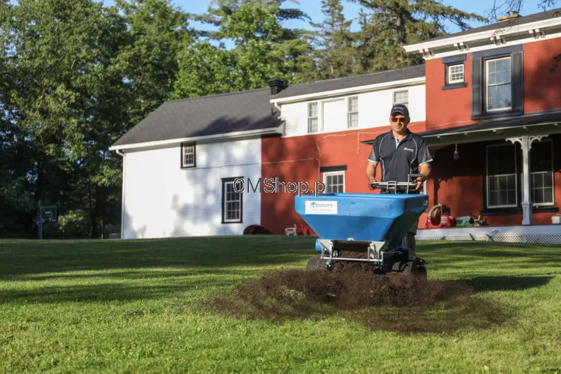 Szeroka rama podstawy poprawia stabilność i umożliwia zaadaptowanie szerszego podajnika taśmowego, zapewniającego skuteczniejszy rozrzut materiału i dogłębną penetrację trawnika.