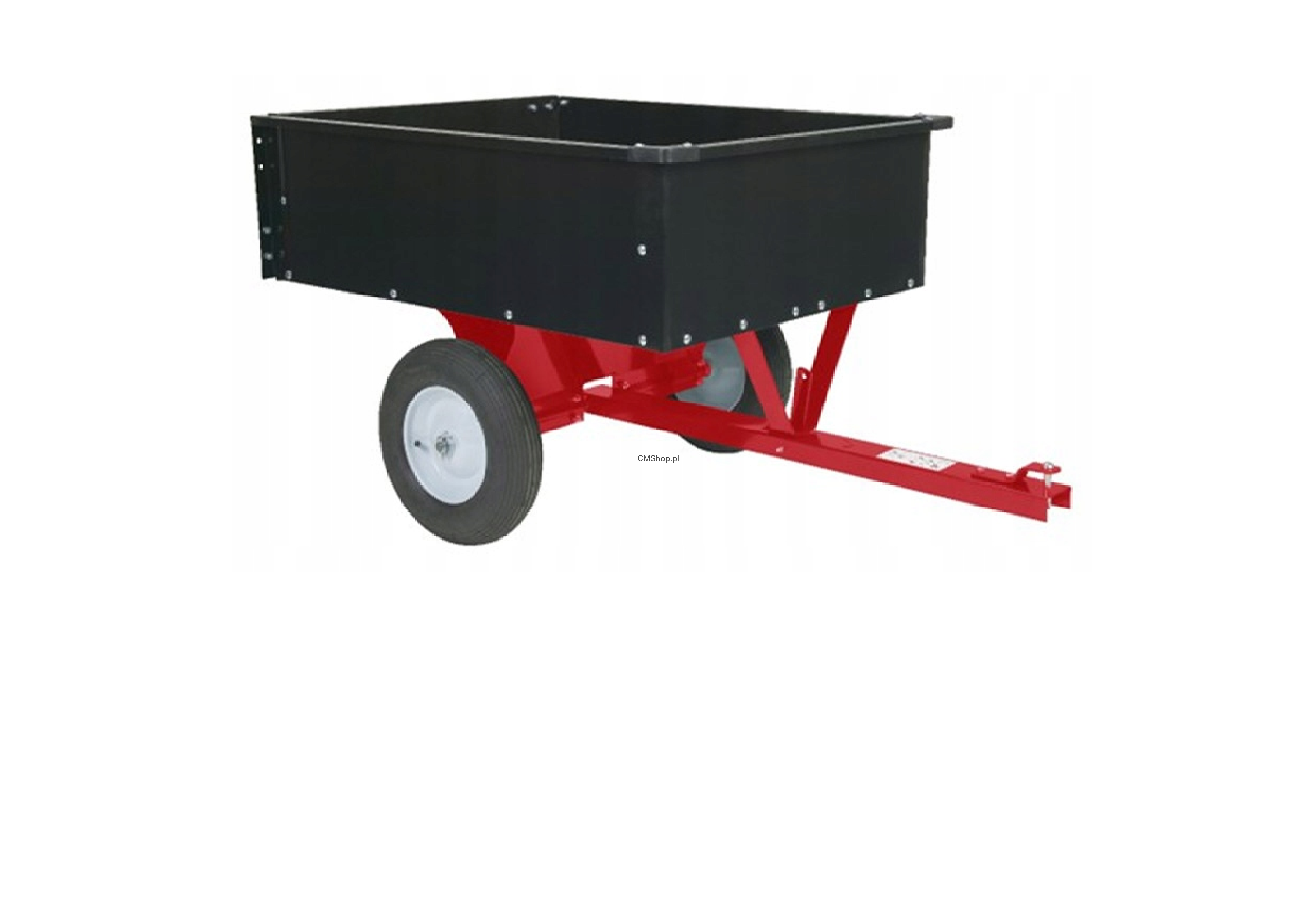 Przyczepka ze stali przeznaczona do holowania między innymi przez traktory ogrodowe.