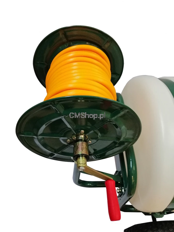 Opryskiwacz jest wyposażony w 25 metrowy wąż oraz lancę z regulacją strumienia cieczy.