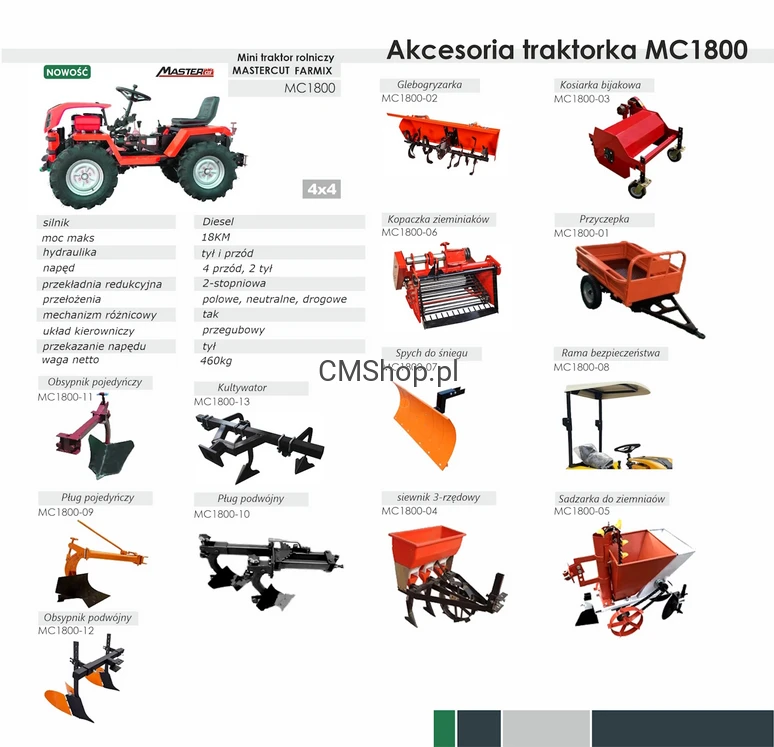 MasterCut MC1800 to kompaktowy, lecz niezwykle mocny traktorek spalinowy z napędem na cztery koła, idealny do prac gospodarczych, ogrodowych i rolniczych. Wyposażony w silnik wysokoprężny Kama 195FE o mocy 18 KM, układ hydrauliczny oraz tylny wałek odbioru mocy (PTO), stanowi wydajną alternatywę dla dużych ciągników w gospodarstwach, sadach, szkółkach i przydomowych terenach.
