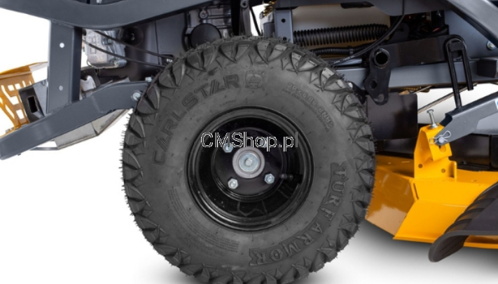 Podwozie zbudowano na rurowej ramie stalowej, typowej dla serii Ultima, zaprojektowanej tak, aby wytrzymywała obciążenia wynikające z codziennego użytkowania bez odkształceń. Koła o wymiarach 13 x 6,5 z przodu i 20 x 8 z tyłu, w połączeniu z oponami o asymetrycznym bieżniku, równomierniej rozkładają obciążenie na trawniku, poprawiają przyczepność i wydłużają żywotność opon.