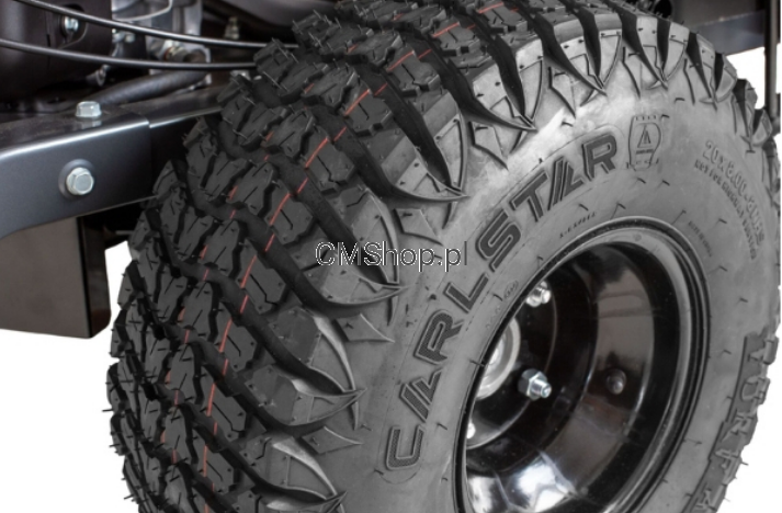 - Asymetryczny bieżnik opon: zoptymalizowana przyczepność, równomierny rozkład masy i mniejsze uszkodzenia trawnika, nawet na lekko wilgotnym podłożu.