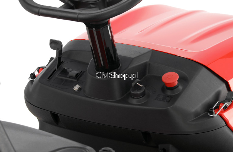 Traktorek wyposażony jest w 5-biegową manualną skrzynię biegów. Posiada elektryczny rozrusznik i pojemny 220-litrowy kosz, co znacznie ułatwia zbieranie trawy z większych powierzchni. Zespół tnący jest uruchamiany i zatrzymywany przez naciśnięcie przełącznika znajdującego się pod kierownicą.