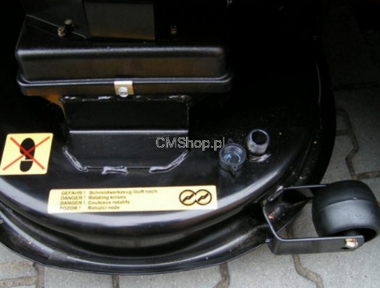 Agregat koszący: typu ALFA spawany , z opaską (patent firmy) zapewnia koszenie trawy o najwyższej jakości oraz wyrzut do pojemnika, konstrukcja wzmacniana z 4 kołami podporowymi